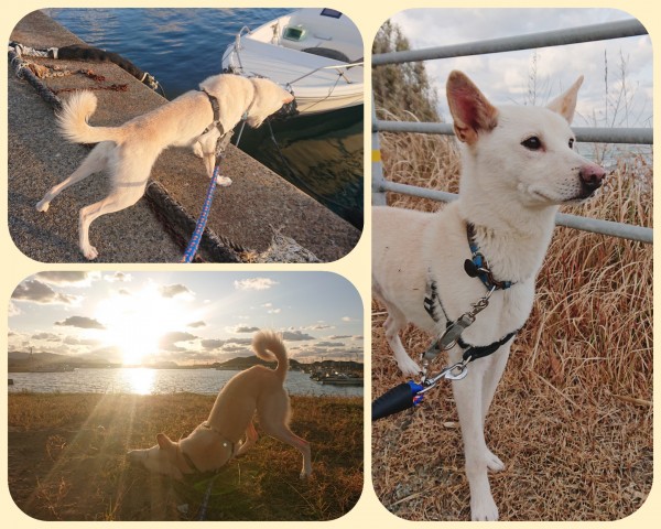 漁港に停めてある船に波が当たるチャプン🌊チャプン🌊という音が怖くて、へっぴり腰なライトくんも、夕日の中でいきなり背中スリスリし始めるライトくんもとっても可愛くて、散々歩いてもお家まで戻ると「まだお散歩する〜♪」と玄関先で駄々を捏ね、私が帰るときには伺った時とは全く違って恨めしそ〜〜な表情で見送るライトくん。