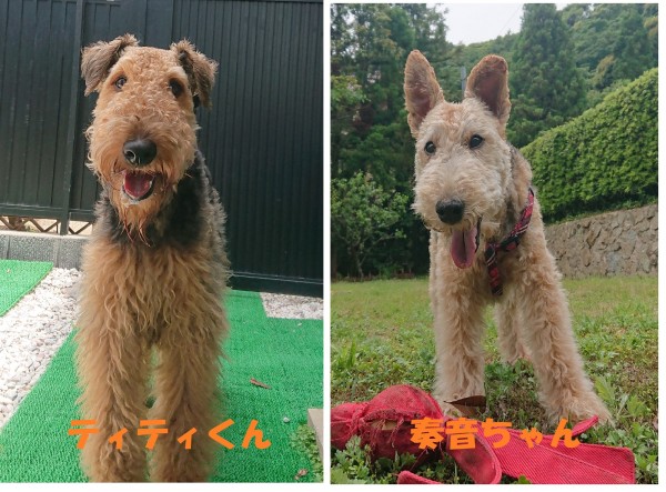 エアデールテリアのティティくん(1歳)とウェリッシュテリアの奏音(かのん)ちゃん♪見た目はよく似ていますが、大型犬VS小型犬で、大きさは倍ほど違います(笑)