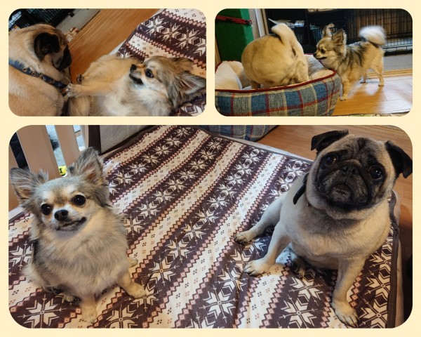 先月末からのお預かりのパグのゴンくん(7歳)と今月初めからのチワワのモモちゃん(1歳半)です♪